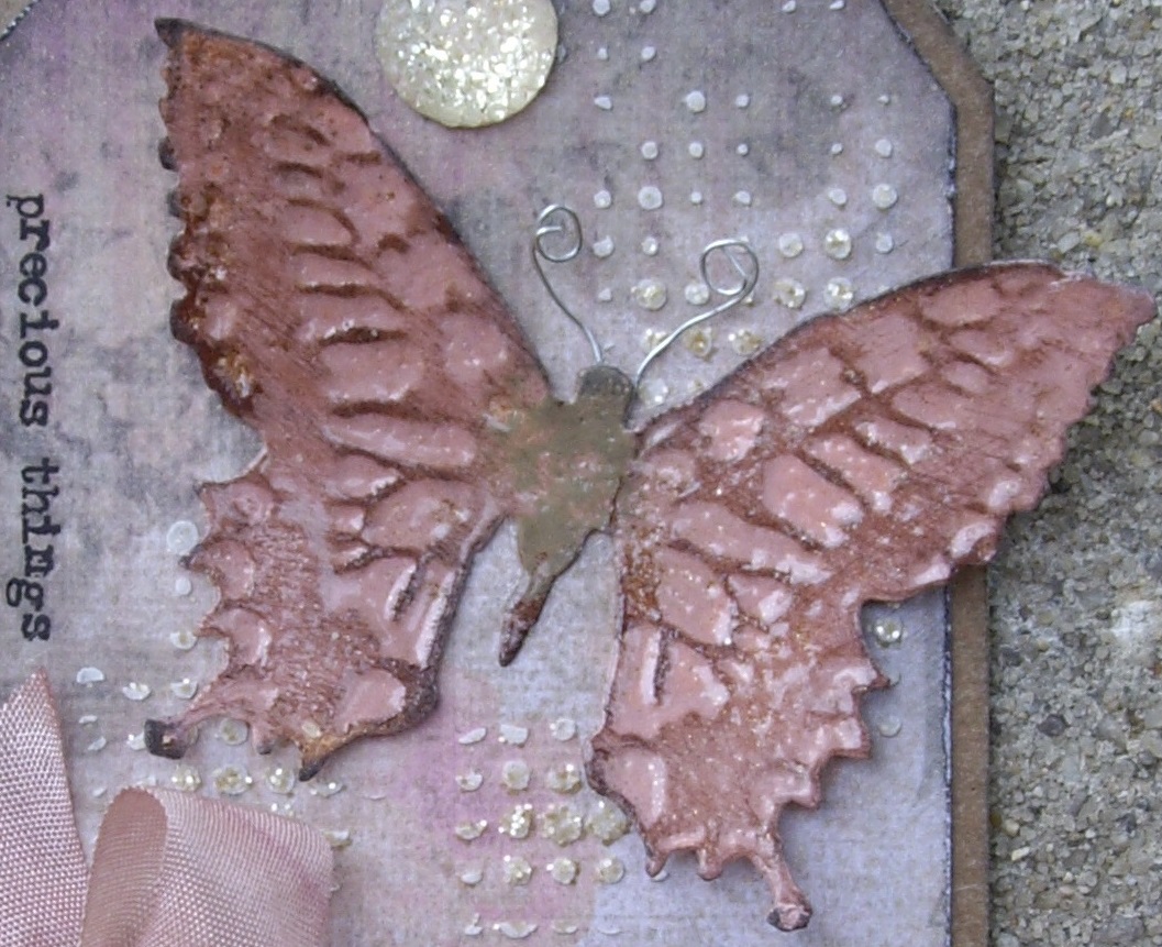 After making so many frilly things the past few weeks, I really felt the need to bring out the inks, paste, glitter and get a bit messy. I've been longing to use my Tim Holtz butterfly duo die and decided to make this tag. Everything used on this tag is from Tim and Ranger.